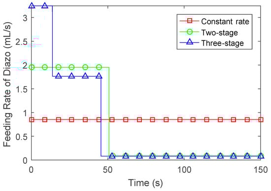Optimal feeding rate profile solved for constant rate, two-stage and three-stage reagent injection policies.