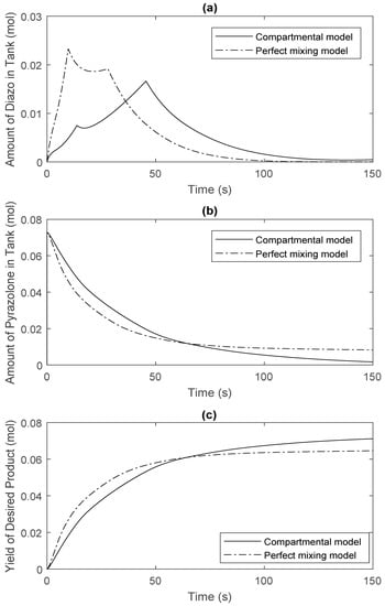 Optimal feeding rate profiles determined with different methodologies are illustrated in Figure 7. It is suggested that process design based on perfect-mixing assumption would lead to faster feeding at earlier period of process. Therefore, a high quantity of diazonium is accumulated in the earlier stage of process (Figure 8a). As a result, the undesired decomposition of diazonium is accelerated, which compromise reaction selectivity (Figure 8d). Moreover, without considering the insufficient consumption of pyrazolone due to imperfect mixing, the overall yield of desired product is hindered, which further reduced product productivity.