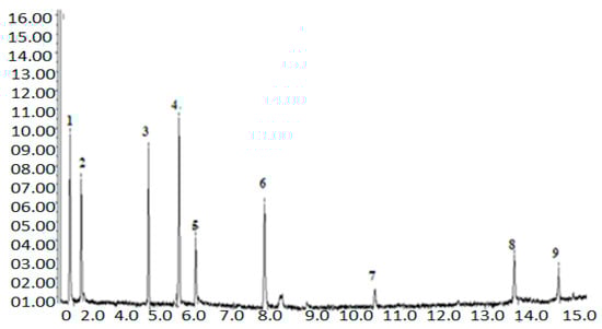 Chromatogram of VOCs detected from recovery test. 1-carbontetrachloride, 2-chloroform, toluene, 4-styrene, 5-bromoform, 6-dibromomethane, 7-is-1,3-dichloropropane, 8-trans-1,3-dichloropropane, and 9-O-xylene.