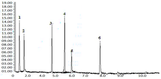 Chromatogram of analysis of water samples collected from residential area. 1-carbontetrachloride, 2-chloroform, 3-toluene, 4-styrene, 5-bromoform, and 6-dibromomethane.