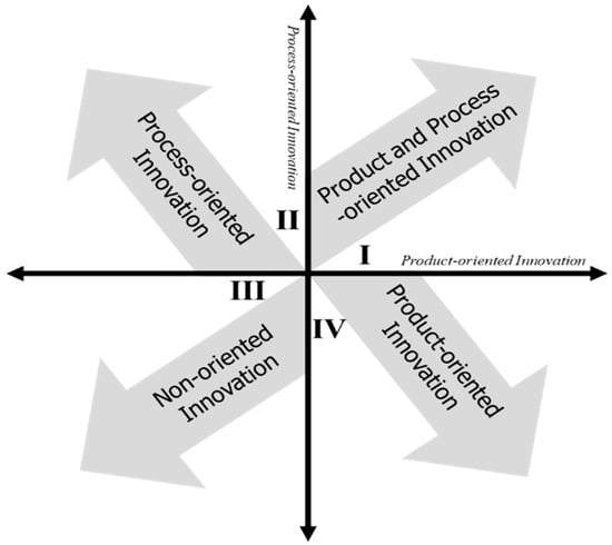 As innovation types could be divided into product innovation and process innovation [13], innovation efficiency is also classified into two: process innovation efficiency and product innovation efficiency. Each firm could be categorized into four based on the innovation types they performed, as illustrated in Figure 2. In Figure 2, the x-coordinate value represents the degree of product innovation orientation for each DMU, and the y-coordinate value indicates the degree of process innovation orientation. The median of the x- and y-axes are used as the criteria for dividing each quadrant to determine the relative innovation orientation of the DMUs.