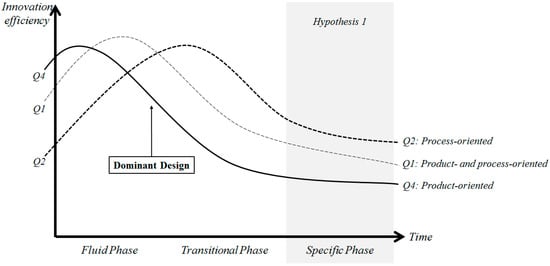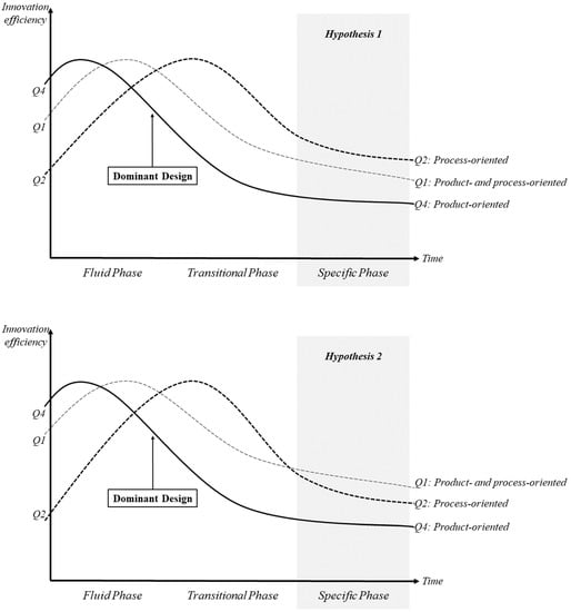 In addition, based on the Aberanthy–Utterback model presented in Figure 1, the research questions in this study can be represented as in Figure 3 below. Performing product innovation will be more efficient for companies in the early stage of the industry. As the industry matures to the transitional phase in which dominant design is formed, on the contrary, it is expected that the more the companies aim for both product and process innovation, the more efficient they will be. However, as the industry matures further and enters into the specific phase, two different hypotheses could be established. The first hypothesis is as follows: companies performing process-oriented innovation will achieve the highest innovation efficiency, those performing both product- and process-oriented innovation will achieve a lower level of innovation efficiency and, finally, those performing product innovation will achieve the lowest level of innovation efficiency. The second hypothesis, on the other hand, is that innovation efficiency would be highest for the firms engaging in both product- and process-oriented innovation, followed by those pursuing process-oriented innovation, and companies with product-oriented innovation will achieve the lowest innovation efficiency.