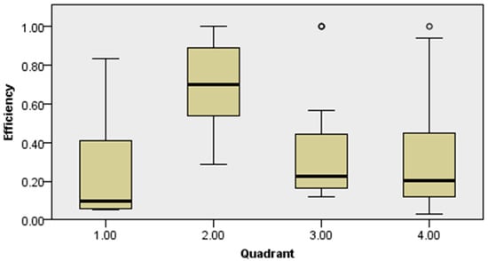 First, we carried out DEA to measure the efficiency scores of each firm. The result of the DEA is summarized in Appendix A. With the efficiency score, we performed Kruskal–Wallis one-way ANOVA, and the results of a pairwise comparison of the efficiency distribution of the four quadrants are as shown in Table 4.