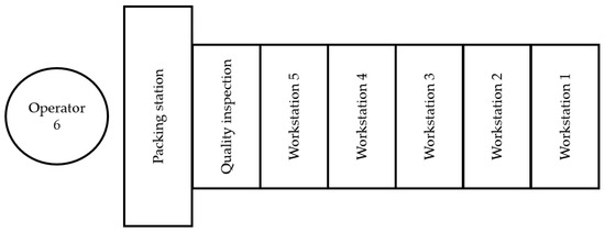 Table 3 shows the estimated observed time (OT), the normal time (NT), and the standard time (ST). ST in workstations 3 and 4 reported a difference of 17 and 35 s, respectively, where the shortest ST was also found (workstation 5). The sum of all STs is equal to 4.07 min for the original production lines. The NT and the ST were obtained using the Equations (1) and (2) [37].
