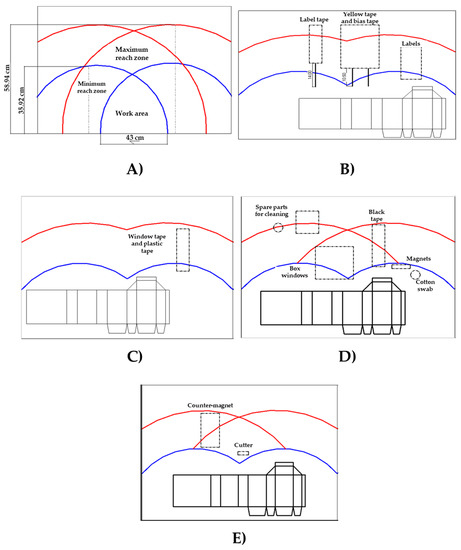 Figure 3 displays the redesigned workstations, where (A) illustrates the overall proposal, whereas (B), (C), (D), and (E) represent the individual redesigns for workstations 1, 2, 3, and 4 with their respective locations of the parts and tools. The findings indicate that ST estimated in the production line was 3.32 min, that is, 45 s shorter than the original ST (i.e., a time reduction of 18%). Table 7 lists the time estimations in each new workstation, and as it can be observed, the difference in time between two workstations is not over six seconds.