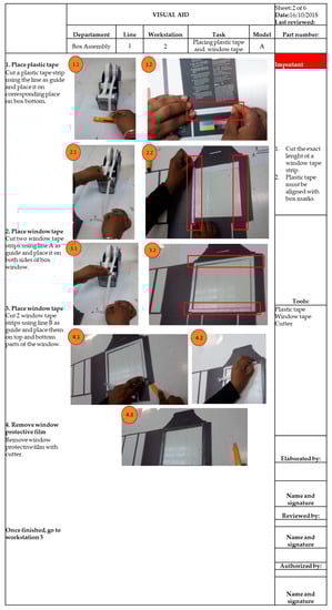At this stage, visual aids and templates were generated for the redesigned workstations. The headings of the visual aid forms included the following information: department name, production line number, workstation number, task name, box model, sheet number, issue date, and last-reviewed date. Similarly, the right side of the form includes important information on the task to be performed. This information is not part of the directions, yet they remind operators about the importance of the details of each task. Below the details section, all visual aids must list the tools that are necessary in the task. In this sense, the operators must make sure that they have all the materials and tools in place before starting to perform a task. Below the material section, visual aids include information to be completed by those who develop the visual aids. The visual aids also contain a picture of each step for the tasks. Next, the operators are asked to perform the steps, one by one, while a picture is taken. In addition, the photographs must be as neat as possible and must clearly illustrate what the operator must do at a particular step. Further, close attention was paid to writing clear and concise descriptions on how each task step is to be performed. A description is related to each image in the aid, but it is not overloaded with information, since the pictures are the key for the aids. Finally, each step of a task was numbered to establish a precise and logic sequence of work events, and therefore, prevent errors and confusions. In total, six visual aids were developed: workstations 1 and 2 were installed with one visual aid each, whereas workstations 3 and 4 were installed with two aids each. Figure 4 and Figure 5 present two examples of the visual aids that were developed.