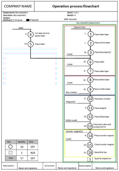 Figure 6 illustrates the flowchart process of the redesigned steps. As it can be observed, the methodology proposes a 16-task process with a total time of 144 s. Notice that tasks 4 and 5 are performed before the box assembly process or when there is no demand for box model A. This allows the operators to have several parts (e.g., labels and corresponding adhesive tape) ready before initiating the box assembly process. Further in Figure 6, the green rectangle delineates the tasks of box assembly. The tasks from workstations 1, 2, 3, and 4 are marked in red, blue, black, and yellow rectangles, respectively. A processing time of 197 s was found, yet 15 min from tasks 4 and 5 were deduced, consequently, the estimated OT was 182 s. This is a value that is close enough to what is shown in Table 7 (i.e., 186 s).