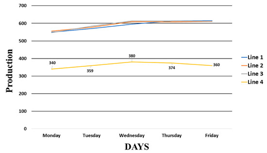 Once the production process was standardized, four assembly lines with four operators each were monitored for one week to assess the production increment. The first three assembly lines worked under the redesigned process, whereas the fourth line operated under the original methodology. As Table 10 indicates, a significant increase of production in assembly line 3 was identified, where 2971 units were assembled, that is, 1158 units more than in production line 4 (i.e., the old methodology). Figure 7 visually presents such results.