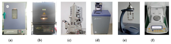 Experimental measurement equipment. (a) Constant temperature oven; (b) muffle furnace; (c) scanning electron microscope; (d) calorimeter; (e) crucible holder; and (f) electronic balance.