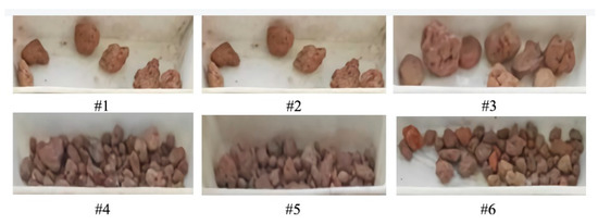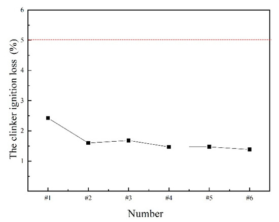 The constant temperature of the kiln was kept at 850 °C, and the materials from the total wastes were continuously fed by imports. Moreover, Table 2 indicates that the state of the wastes was semi-fluid. The feeding speed and time were 0.05 kg/min and 10 min, respectively, and the total feeding was 0.5 kg. In the experiment, the slag appeared after the mixed waste was sent to the kiln for 60 min. Thus, the slag was collected after 60, 70, 80, 90, 100 and 110 min from when the material was sent. The slag was labelled #1, #2, #3, #4, #5 and #6. The clinker ignition loss was determined by a close roaster. The result is shown in Figure 4.
