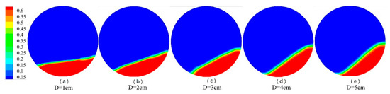 At the initial moment, the particle surface tends to be flat and evenly distributed at the bottom of the rotary kiln. The volume distribution under different particle diameters in stable state is shown in Figure 7, Figure 8 and Figure 9. The results showed the surface of the material presented an inclined angle to the horizontal plane. The material surface gradually tilted and became slightly S-shaped. With the increase of the rotational speed and the diameter of the particle, the particle movement accelerated and experienced sliding, slumping, rolling, cascading and cataracting movements. Centrifugal motion did not occur because of the rotational speed limit. When the particle diameter was 1 cm, the particle movement was only slumping, and when the particle diameter was 5 cm, the particle movement could achieve a cataracting motion.