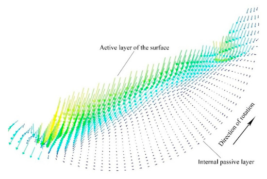 The velocity vector of particles can directly reflect the motion characteristics of particles in the kiln. The particle area is evidently layered, and the surface speed of the material is considerably larger than the internal stacking speed (Figure 10). This layer is the active layer of the material particles, which is the main area of material mixing and heat exchange. The internal relative speed is small; it is the passive layer, which is the area where the mixing and heat exchange are weak. As shown in Figure 10, the direction of the particle velocity in the active layer is opposite to the direction of the kiln wall movement. When the particles reach the bottom, they begin to change direction in accordance with the movement direction of the kiln wall. The velocity direction of particles in the passive layer is the same as that of the kiln wall, and the particles re-enter the active layer of the surface when they reach the top of the material bed on the right side. The velocity at the free surface of the particle is large, and the velocity vector at the top of the active layer is at an angle to the bed surface. Thus, particle collisions may occur at the upper right of the rotary kiln. The particles fly out under the action of rotational inertia and rejoin the material layer under the influence of gravity, which affects the surface of the active layer. The simulation results are consistent with the material movement theory of the rotary kiln.