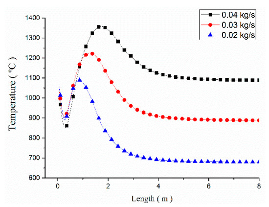 Figure 12 shows the temperature curves in the kiln under three calculated cases of burning diesel oil only. The results showed that the three cases had almost the same trend of temperature change. As the mass flow of diesel oil increased, the temperature gradually rose in the kiln. The maximum combustion temperature of diesel oil with a mass flow rate of 0.04 kg/s reached 1400 °C. This temperature may have exceeded the ash melting point; thus, the ash became molten, and slag formed on the kiln wall. The combustion temperature of diesel oil with a mass flow rate of 0.02 kg/s was relatively low, and the temperature in the kiln was only 700 °C, which may have resulted in the insufficient combustion of the wastes. The temperature field with a mass flow rate of 0.03 kg/s was moderately long, and the temperature in the middle of the flame reached 1200 °C. A large central combustion zone was formed at a distance of 2 m from the kiln inlet, which was conducive to the full mixing combustion of the wastes. The outlet temperature of the kiln was less than 1000 °C. Diesel fuel with a mass flow rate of 0.03 kg/s can not only maintain a high combustion temperature but could also save fuel.