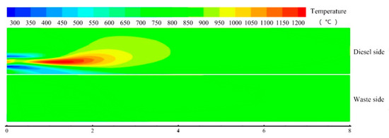 The temperature field of the rotary kiln with waste combustion was simulated, as shown in Figure 13 and Figure 14. The diesel and waste side are shown in Figure 11. The rotary kiln had two high-temperature zones. One zone was obtained by diesel oil injection and combustion, and the other one, which was obtained by mixed wastes that roll over and forward in the axial direction, was burned by gas from the diesel oil combustion of the rotary kiln. The temperature of the material gradually decreased from top to bottom. The lower temperature at the bottom of the kiln was due to the cascading movement of the waste, which burned on the surface of the bed. The heat released by waste combustion was relatively low. The diesel oil combustion temperature was high, and the wastes were rapidly heated in the kiln. The temperature of the wastes gradually rose, reaching the ignition temperature at a distance of 2 m from the kiln inlet, and the wastes began to burn. Then, the fuel bed went into the main combustion stage. The temperature of the flame area was up to 900 °C, and the mixed wastes could be sufficiently burned before leaving the kiln.