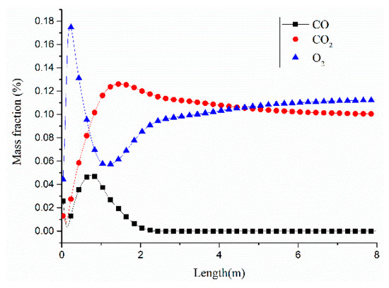 Figure 15 shows the gas mass distribution curve on the centerline of the waste inlet (Figure 10). The study of the distribution of CO concentration in the rotary kiln could obtain the combustion status inside the kiln. The CO in the kiln was mainly derived from the pyrolysis of the wastes. The CO concentration was mainly concentrated at 1.5 m from the waste inlet, whereas the content in other regions was small. Given the sufficient oxygen in the kiln to mix well with the CO, the CO reaction gradually became complete, and the CO content at the final outlet tended to zero. CO2 mainly came from the combustion of volatile matter and fixed carbon and reached a high concentration at 2 m in front of the kiln. From the O2 concentration distribution, the concentration of oxygen from the inlet was reduced due to the large amount of combustion consumption of the volatile matter. In this situation, the incomplete combustion of the waste produced the most CO. In the latter half of the rotary kiln, only a few combustible components existed due to the burning of waste; thus, the oxygen content was high.
