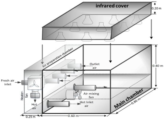 Schematic representation of the experimental incubator showing the main chamber, air preparation chamber, and the infrared cover.