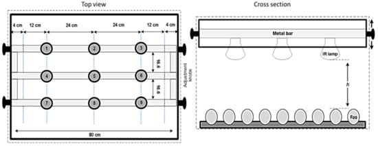 Schematic representation of the infrared cover showing the nine IR lamps (top view graph) and the adjustable distance from the eggs (h) using the adjustment knob (cross section graph).