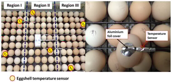 The location of the eggshell temperature sensors within each region (I, II and III) in the experimental incubator (left picture) and the temperature sensor placed on the equator of the eggshell covered with an aluminium foil to be protected from the IR heating (right picture).