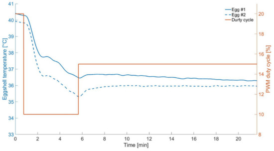 Step changes in the pulse width modulation (PWM) duty cycle (%) and the corresponding responses of the eggshell temperatures of two eggs in region II.