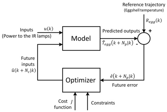 where, is the change in input (power applied to the IR radiators), is the predicted output (eggshell temperature) sequence, is the desired value of the output, is the minimum of the prediction horizon, and are the weighting factors. The block diagram depicted in Figure 7. shows the basic structure of the designed MPC system in the present work to control the eggshell temperature using localised IR heating.