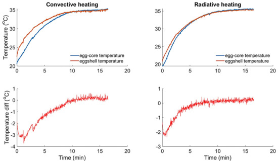 Figure 8 shows a comparison between the temperature responses of the equipped eggs under convective heating and radiative heating (at PWM of 10%). The results (an example is shown in Figure 8) have shown that the temperature difference between the egg-core and the eggshell was vanishing (quasi zero) faster (5.2 ± 1.5 min) in case of radiative heating in comparison to convective heating (9.4 ± 1.8 min). The average time constants of eggshell temperature in case of radiative and convective heating were 7.6 ± 1.2 min and 7.45 ± 1.23 min, respectively. The steady-state eggshell temperature at different power levels (PWM) applied to the radiative lamps are shown in Figure 9. A linear regression model was fit the relation between the eggshell temperature (°C) and PWM (%) with a slope of 0.42.
