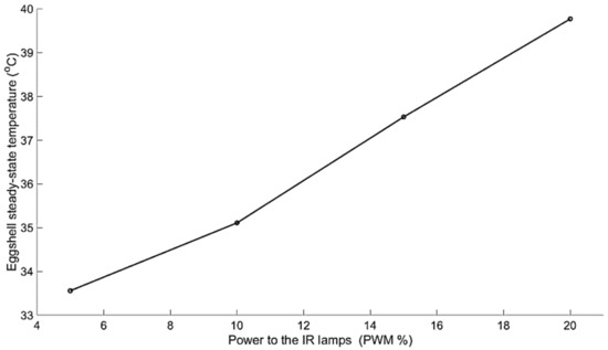 The resulted steady-state temperature of the eggshell at different PWM (%) to the IR lamps at distance = 0.15 m.