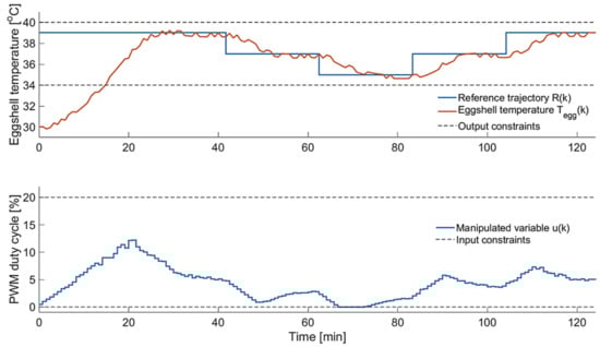 During the incubation process, the thermoregulatory system of the chicken embryo evolves through different stages from a poikilothermic to a homeothermic system. Hence, the thermal response of the fertile egg to changes in ambient temperature is different from one day to another during the embryonic development [15]. Such a complex and sensitive process is subject to a number of limitations and constraints pertaining to the ranges of tolerable eggshell temperatures and acceptable IR operating power range. Table 2 shows the applied constraints on the controlled, , and the manipulated, , variables during designing the MPC system. Based on the results of pilot experiments, the control signal, , was constrained within the allowable PWM range between 0 and 20%. In order to prevent large increments in the rate of change in the manipulated variable , the maximum boundary was set as small as 0.5%. On the other hand, to prevent overheating a fast decrease in the IR heating was allowed by setting the minimum boundary to −2%. Additionally, the controlled variable, , was constrained within the allowable incubation range between 36 and 40 °C.