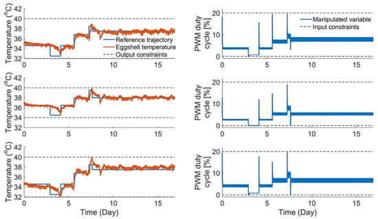 Although the controllers were able to follow the reference trajectories in each zone (region), it was noticed (Figure 11) that the responses of the eggshell temperatures in each zone exhibited an oscillation around the set point values with an average error of ±0.5 °C. This can be attributed to the unmeasured disturbances resulting from the interaction between adjacent zones with different temperatures and to the control actions of the PID (Petersime FocusTM) controller, which regulates the incubation air temperature around the eggs in the whole incubator. Another possible reason for such oscillated deviation between the actual eggshell temperature and the set point is the fact that, during this study, we have designed the MPCs based on one predictive model (12). That with the assumption that the DTF model (12) is representative of the controlled dynamic system (incubated embryo). However, in reality as shown in previous studies (e.g., [15]) the incubated embryo is inherently a nonlinear system, which exhibits different dynamics and responses almost every embryonic day. Therefore, we are proposing for future work an adaptive control approach, in which a linear model (with a fixed model structure as (12)) is estimated on the fly as the operation conditions are changing, hence the internal system-model of the MPC is updated at each scheduled time period (e.g., each day).