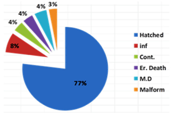 The results of the four full incubation trials showed that combining both convective and radiative heating mechanisms was successful to hatch the incubated eggs with average hatch-of-fertile (HOF = (hatched chicks/number of true fertile eggs) × 100) of 84.0% (±0.5). A breakout of the unhatched eggs was performed [35,36] in the end of each incubation trial. The average breakout results of the unhatched eggs are shown in Figure 12.