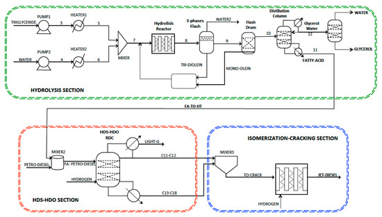 Figure 2 shows a simplified flow sheet of the intensified three-step reactive separation process for bio-jet diesel production. The first section (hydrolysis) consists of two pumps operating from 1 to 30 atm and two heat exchangers where the exit temperature is set to 280 °C. The heterogeneous hydrolysis reactor operates at 30 atm and it consists of two 25 m length tubes with 0.5 m of diameter. Further, a sequence of a three-phase flash and a two-phase drum are used to separate the fatty acid-glycerol-water mixture and the unconverted glycerides that are recycled to the hydrolysis reactor. Finally, two distillation columns are used to separate the pure fatty acid from a low concentration glycerol-water mixture and to produce pure glycerol. The second section, hydrodesulphurisation-hydrodeoxigenation (HDS-HDO) consists of a reactive distillation column (RDC) where a mixture of petro-diesel and fatty acid is fed to the RD column at stage 9 and excess hydrogen is fed at the bottom. The gases produced by the HDS-HDO reactions are released from the two-phase condenser. The exit liquid mixture of C11–C12 linear hydrocarbon chains is mixed with the exit stream containing C17–C18 hydrocarbons produced by the HDO reactions and the ultra-clean petro-diesel products. The third section consists of a heterogeneous hydro-conversion reactor where the long linear hydrocarbon chains (C11–C18) are isomerized and cracked to attain the bio-jet diesel.