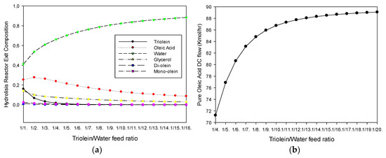 (a) Effect of the triolein-water feed ratio on the hydrolysis reactor exit composition. (b) Effect of the triolein-water feed ratio on the distillation column bottom flow (stream 11).