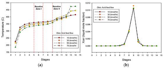 The molar flow of hydrogen required for the HDS and HDO reactions as a function of the oleic acid content in the feed is shown in Figure 6a. It can be noted in Figure 6a that, for an oleic acid feed flow greater than 10 (kmol/h), the temperature of the condenser is reduced to 215 °C, and for a feed flow of 70 (kmol/h), the required hydrogen is increased to 400 (kmol/h) and the temperature of the condenser should be diminished to 185 °C. It should be pointed out that, if the temperature of the condenser is not decreased, the numerical convergence of the RDC simulation is not reached. Thus, a control loop between the source of vegetable oil (oleic acid) and the hydrogen supplied should be linked to the temperature of the condenser. The liquid water composition profiles along the RDC for different oleic acid feed flows are shown in Figure 6b. It can be noted in Figure 6b that the concentration of liquid water increases from reactive zone I (steps 5–7) to the upper part of the RDC. Liquid water is mainly produced in reactive zone II (reactive stage 9–11) by the hydrodeoxygenation and decarbonylation reactions and its molar fraction increases continuously from stage 9 to the upper part of the RDC, as the concentration of oleic acid in the feed is augmented. Therefore, in order to minimize catalyst deactivation and corrosion of the RDC equipment, the amount of oleic acid in the mixture fed should not be higher than 70 (kmol/h).