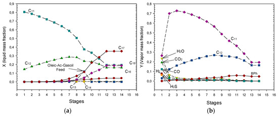 Figure 7a shows the hydrocarbon liquid composition distribution. It can be noted in Figure 7a that the bottom exit stream contains mainly the linear hydrocarbons C17, C18, C16, C14, and C13. At the top of the RDC a rich liquid mixture of C11 and C12 linear hydrocarbons is obtained. It should be pointed out that such linear hydrocarbons (C11–C18) are further mixed and fed to the isomerization-hydrocracking reactor (see Figure 2). Figure 7b shows the gas composition profile along the RDC. In the case of the hydrotreating RDC, the gases produced are mainly driven in the vapour phase at each equilibrium stage and released from the partial condenser at the top of the RDC. It can be noted in Figure 7b that the gases produced by HDS and HDO reactions: CO2, CO, steam and H2S and the unconverted excess of hydrogen are released at the top of the column. It is interesting to observe that the vapour composition of C11 and C12 decreases at the top of the column.