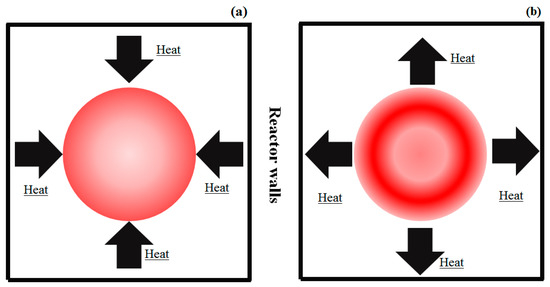 The temperature inhomogeneity issue rises again if composite polymers are processed. As shown in Figure 5, different points of the composite material are heated by MW irradiation with different efficiencies. Undri et al. [32] studied the behavior of wasted tires during MAP and used zinc sulfide phase changes to demonstrate the presence hotspots of over 1273 K [29]. Similar behavior could be detected while processing printed board circuits [86,87] and food packaging composites that contain aluminum foil [88]. With such composites, both Qg and HR are related to the material topology and are deeply affected by metal-containing zones.