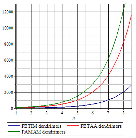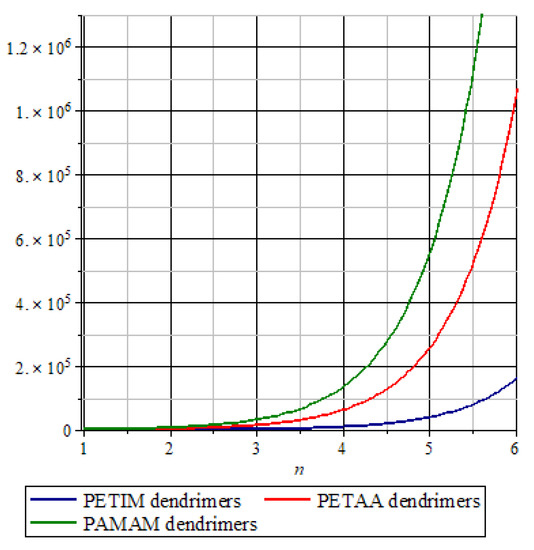 PolyEThyleneAmidoAmine (PETAA) dendrimers have various properties of PAMAM dendrimers such as the number of bonds between the surface, and the dendrimer core is the same. Moreover, the number of surface primary amino groups and tertiary amino groups in PETAA dendrimers are also the same as in PAMAM dendrimers. Other than that, the unique synthesis process of the PETAA enhances its potential for the large-scale production, which results in more application in biomedical sciences [44]. Consequently, the study of PETAA becomes a very respected topic of research. The molecular graph of this dendrimers is denoted by , where n represents the generation of The number of vertices in is and the number of edges is . The molecular graph for is shown in Figure 2.