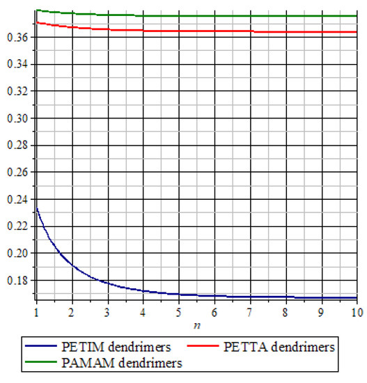 In this section, we present our theoretical outcomes and deduce which of the dendrimer structures depicted above is more irregular than the remaining ones with respect to a specific irregularity index. Each dendrimer structure relies on a single variable n. We plot the graph with irregularity index of , , and (on a single graph) as a dependent variable and n as an independent variable. We observe that all the irregularity indices behave in a particular way with the increase in the value of n. We provided the graphical appearances of these indices with respect to the change in the growth stage of the dendrimer structure. In this graphical examination, the blue colour shows the graphical functioning of the PETIM dendrimer structure, the red colour shows the graphical behaviour of the PETAA dendrimer structure, and the green colour shows the graphical response of the PAMAM dendrimer structure. We present the values of various irregularity indices for the dendrimer structures in Table 1, Table 2 and Table 3. With the help of these tables, the comparative behavior of these irregularity indices for dendrimer structures has been expressed in Figure 4, Figure 5, Figure 6 and Figure 7. These figures show that the molecular structure of PAMAM dendrimer is highly irregular as compared to the other dendrimer structures and the molecular structure of PETAA dendrimer is more irregular than the molecular structure of PETIM dendrimer.