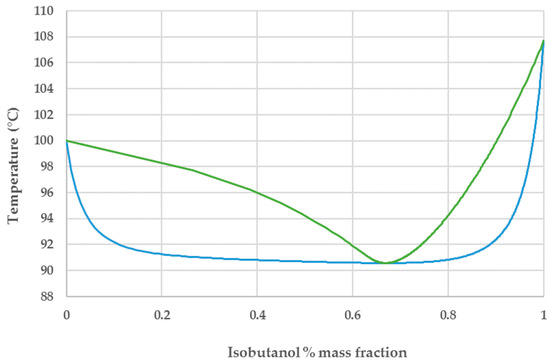 In the case of SCA, it was assumed that the final isobutanol titer is 22 g/L with a yield of 0.37 g/g. In the case of SCB, the fermentors are equipped with a vacuum stripping system that processes ~47 m3/h of fermentation broth, in order to maintain the isobutanol concentration in the fermentor below 22 g/L. The use of vacuum was originally proposed for the reduction of ethanol toxicity to yeast in ethanol production processes [42,43] and has been shown to be effective for butanol, despite the fact that the latter is less volatile than water [44]. The feasibility of vacuum stripping is evident from the water-isobutanol VLE chart depicted in Figure 2. When a water–isobutanol mixture with sub-azeotropic composition is heated at a temperature above its bubble point, it forms a vapor phase where the isobutanol content is substantially increased. The fermentation broth is circulated through a vacuum flash tank operating at very low pressure (i.e., ≈7 kPa) where an isobutanol-rich vapor phase and an isobutanol-depleted liquid phase are generated. The vapor phase, after condensation, is sent to the purification section while the liquid phase is recycled back to the fermentor. The isobutanol titer in the combined stream from the final fermentation broth and condensed vapor phase is around 50 g/L, the same as the value reported by Baez et al. for gas-stripping integrated product removal [34]. In this case, the fermentation yield is equal to 0.39 g/g.