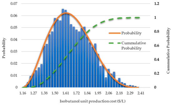 Figure 5 presents the results of the Monte Carlo simulation for the case of SCB. The results are fitted by a beta distribution with parameters α = 3.15 and β = 4.73. As illustrated, the unit production cost of isobutanol varies from $1.16/L to $2.38/L. From the cumulative probability distribution function, it is possible to determine the probability that the unit production cost of isobutanol will fall below a certain threshold value. For example, based on the results obtained, there is a 94.2% certainty that the unit production cost will be below 2$/L and 24% that it will be below $1.5/L.