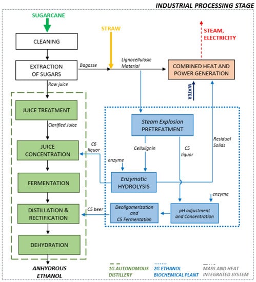 - Dias, M.O.S.; Cavalett, O.; Maciel Filho, R.; Bonomi, A. Integrated first- and second-generation processes for bioethanol production from sugarcane. In Sugarcane-Based Biofuels and Bioproducts; John Wiley & Sons: Hoboken, NJ, USA, 2016; Available online: https://www.wiley.com/en-us/Sugarcane+based+Biofuels+and+Bioproducts-p-9781118719916 (accessed on 25 October 2018).