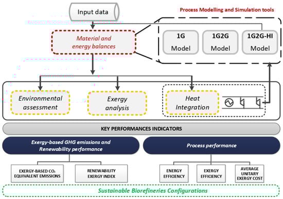 To understand the effects of two levels of process integration (mass and heat), the 1G and 2G ethanol production process were conceptually designed and simulated. Then, the obtained mass and energy flows were used to identify opportunities for heat integration by applying the pinch methodology. Finally, three process performance indicators (i.e., energy efficiency, exergy efficiency, and the average unitary exergy cost) and two exergy-based GHG emissions and renewability performance indicators (i.e., specific CO2 equivalent emissions and renewability exergy index) were calculated and compared to the two levels of integration and with respect to the autonomous ethanol production process. The flow diagram of the conceptual process design, simulation, and assessment methodologies is shown in Figure 2.