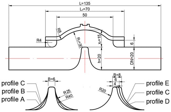 In this paper, the LiquidlensTMLLG4 ultra-pure water treatment system of ENTEGRIS Company is taken as the reference of working condition of diaphragm valve. The relevant size parameters of DS12-2M-12F-3 manual diaphragm valve are taken as the reference for modeling. The flow field structure size can be obtained by simplification (Figure 6). The shape of the ridge has a major influence on the flow state and loss of the medium in the weir diaphragm valve. Five different sizes of the ridge structures (Figure 6) are designed to explore their effects on the flow characteristics of the diaphragm valve.