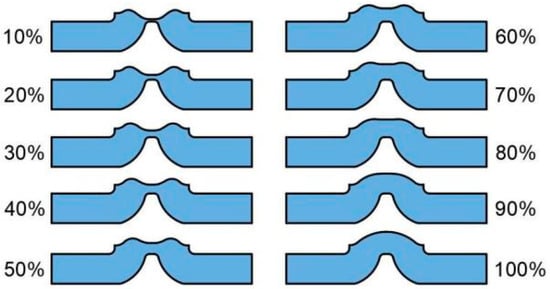 According to the flow coefficient diagram (Figure 13a), with the increase of opening, the flow performance increases, pressure loss decreases, and flow coefficient increases. However, in the range of 80–100% opening, the flow coefficient has experienced a process of first rising and then falling, and the flow performance is the best around 90% opening (Figure 13b). By comparing the inner surface shapes of 80%, 90% and 100% open diaphragms, it can be seen that the central area of the inner surface of 90% open diaphragms is close to the plane, while the central area is concave when the valve orifice is fully open. It can be inferred that the flow performance is better when the central area of the inner surface of diaphragms is horizontal than that when the valve orifice is concave. It can be guessed that the central area will be approximately planar when the diaphragm is manufactured, or a 10% pre-clearance will be given when the diaphragm is installed to ensure the best flow performance when the diaphragm is fully open.