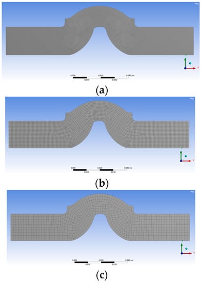 Mesh of different sizes under profile E. (a) for 0.5 mm; (b) for 1 mm; (c) for 2 mm.