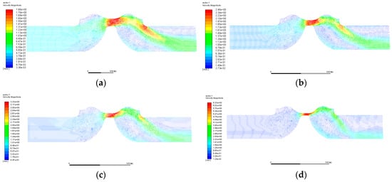 Cloud Map Display of Velocity Field at Different Openings shows that as the valve opening decreases, the velocity gradient increases. (a) for 40% opening; (b) for 30% opening; (c) for 20% opening; (d) for 10% opening.