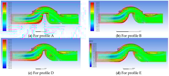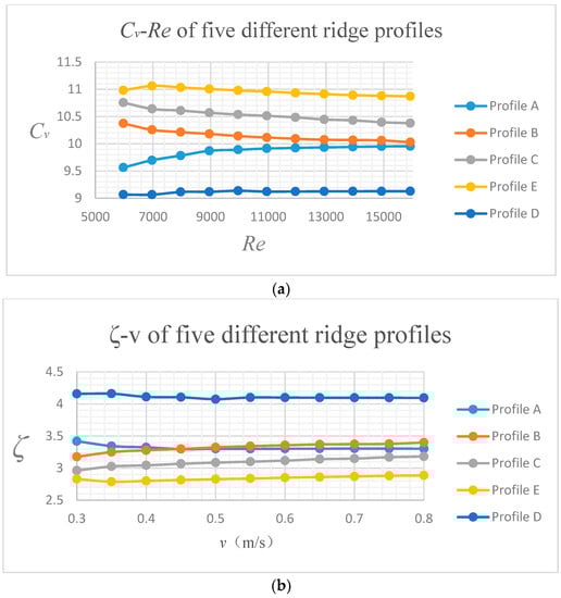 In general, the flow coefficients of profile B, C, and E decrease with the increase of flow velocity, which indicates that the greater the flow velocity, the greater the turbulent fluctuation, the more pressure loss is formed, which is in accordance with the general law (Figure 11). The flow coefficients of profile A increase obviously with the increase of Reynolds number, because the ridge of profile A is too steep and the flow velocity is lower. As a result of the blocking effect, it is not easy for the fluid to flow through the ridge. On the contrary, when the flow velocity is high, the fluid momentum is large and easy to pass, so the pressure drop decreases and the flow coefficient increases. The flow coefficient of profile d does not change obviously with the increase of Reynolds number. The possible reason is that the side of the ridge of profile d is gentle and easy for the fluid to pass through, but the width of the ridge top is wide. The narrow passage leads to an approximate sharp angle, which leads to an excessive bending angle of the flow passage, approaching 180 degrees. The fluid is not easy to turn, resulting in pressure loss. The two factors restrict each other, resulting in the flow coefficient almost unchanged.
