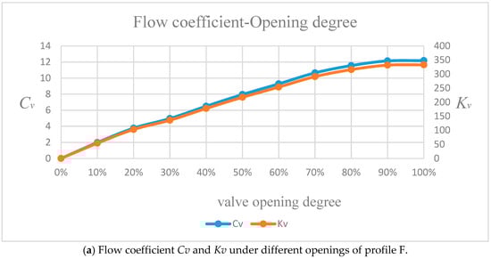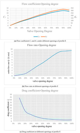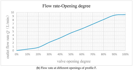 The flow characteristic curve of the valve shows the flow through the valve at different openings in the process of opening and closing []. It is an index to describe the flow control performance of the valve. The higher the linearity of the curve, the larger the linearity range, the better the flow control performance of the valve. The curve was obtained experimentally.