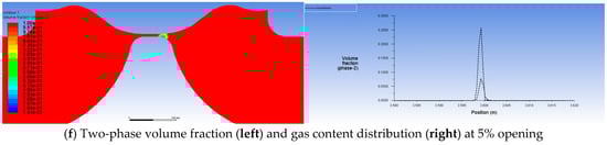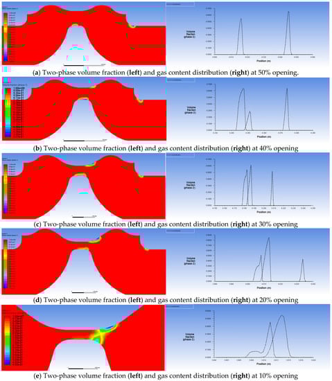 Under the given boundary conditions, cavitation begins to appear near the lower boundary of the valve orifice and the corner of the outlet bending when the opening of the diaphragm valve drops to 50%. With the opening decreasing, the cavitation area gradually expands and develops to the upper boundary of the valve orifice (Figure 14). When the opening is below 20%, the cavitation area shrinks to the valve orifice and cavitates near the corner of the outlet bending. When the opening is less than 10%, the cavitation area continues to shrink near the center of the valve opening.
