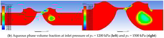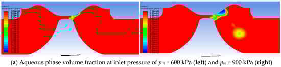 The reason is that when the pressure difference between the two ends Δp is greater than 800 kPa, the cavitation phenomenon becomes serious and more cavitation bubbles are blocked at the valve mouth, which leads to flow saturation and deviates from the theoretical flow input. And Figure 16 shows a volume fraction nephogram at different inlet pressures.