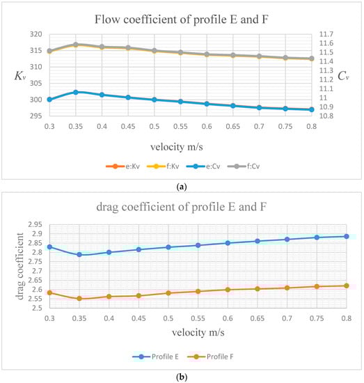 The flow coefficient and local resistance coefficient (Figure 18) of the optimized profile are improved to a certain extent compared with the prototype profile E before optimization; with the increase of the opening of the profile F valve, the flow coefficient shows an increasing trend, and no longer decreases with the increase of the opening when approaching full opening (Figure 19a). In addition, some improvements have been made in the flow control characteristics of the valve under profile F. In addition to the good linearity, the linearity range has also been enlarged at large valve ports (Figure 19b).