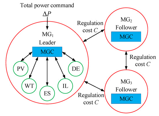 The control objective is to ensure the overall real-time power balance of islanded multi-microgrids and reduce the power regulation costs, which is equivalent to the problem of converting the economic dispatch problem into the consensus of the regulation costs in the power allocation process [30]. Therefore, the role of each MGC is as the agent in the network and the regulation cost of each microgrid is the concerned consensus variable. Under the premise that interconnected multi-microgrids system belongs to the same community of interests, the regulation of each microgrid is guided by the economic signal of the whole system, i.e., the regulation cost signal. Thus the economy of islanded multi-microgrids operation can be improved by reasonably allocating the regulation power. The islanded multi-microgrids adopt the “leader‒follower” model [31,32]. The leader MGC is a communication center of all microgrids, which calculates the total power command, communicates and cooperates with other MGs, and balances the power of the entire control area. The follower exchanges the regulation costs with its adjacent MGs. After the communication iteration of each microgrid, the total power command is delivered to each microgrid and the MGC delegates the power commands of each control unit in the microgrid according to the established strategy. Because each MGC does not need to acquire the global information of the system, the information needed by each microgrid in the iteration is only local information, and the regulation cost information transmitted by the neighbors, so the communication burden is small.